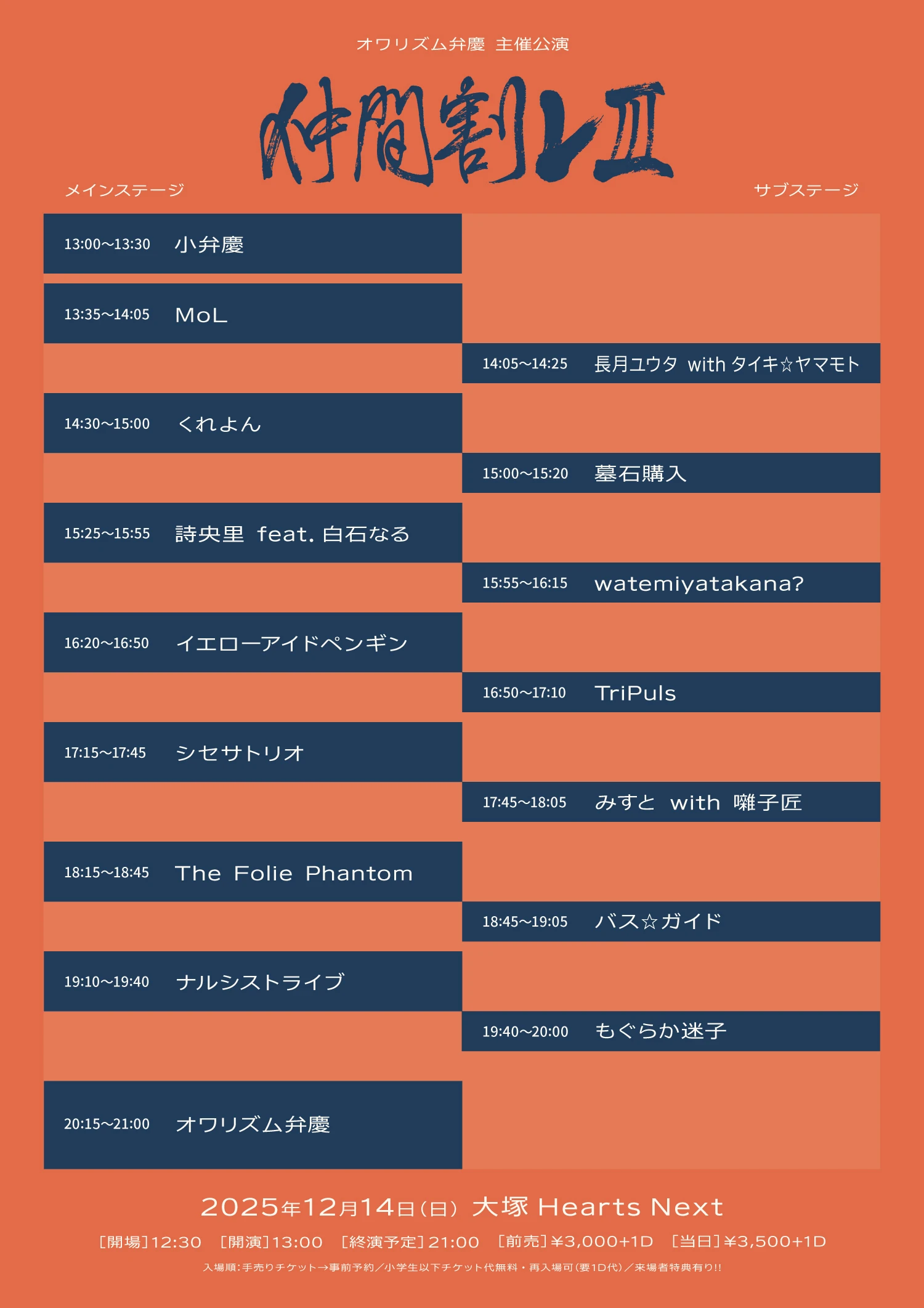 小編成版オワリズム弁慶、縮めて小弁慶。少人数ならではの機動力の高さと、本家より豊富な音楽的ボキャブラリと実験的な音楽性が各地で話題になっている。今回は『仲間割レIII』のオープニングアクトを担当し、『エヌ弁チ慶どど自慢』を上演する。